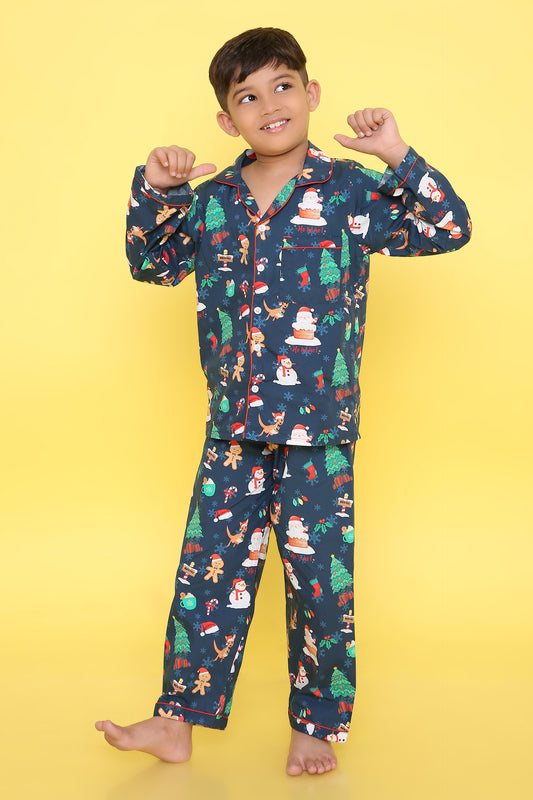 Red, White and Green Cotton Plaid Nightsuit with Cute Santa Claus Embroidery on Pocket