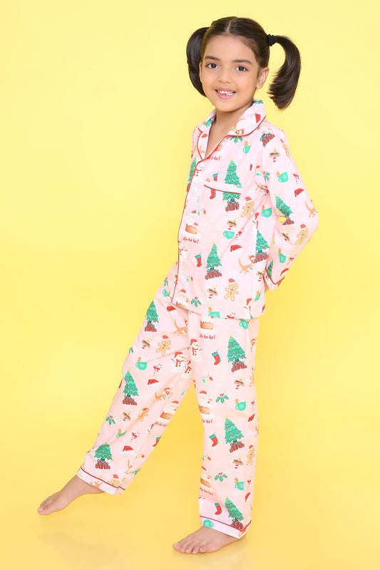 Red and White Cotton Twill Plaid Nightsuit with Cute Santa Claus Embroidery on Pocket
