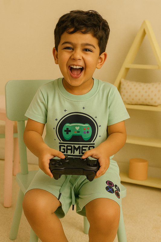 Boys' Cotton Playday Shorts Set with Fun Gamer Print- Sea Green