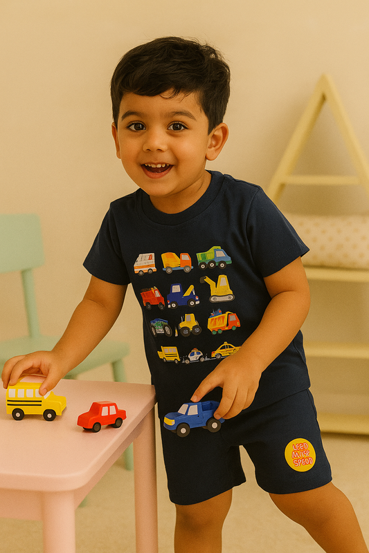 Boys' Cotton Playday Shorts Set with Cute Vehicles Print- Navy