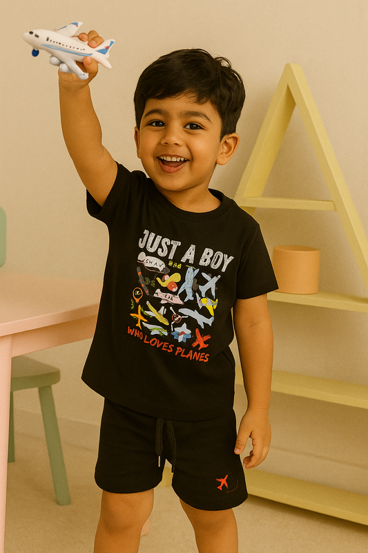 Boys' Cotton Playday Shorts Set with Cute Aeroplane Print- Black