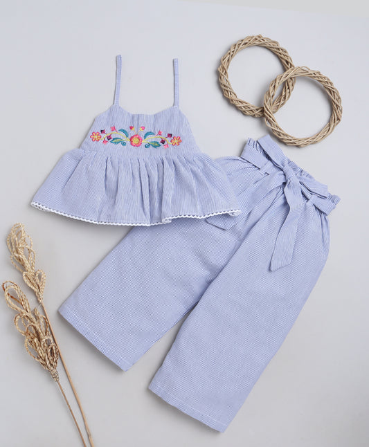 Stripes Coord set with paper bag pants and crop top with Smart Floral embroidery on yolk