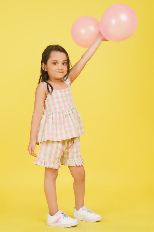 Pink and Green Coord set with shorts and crop top and lace detailing
