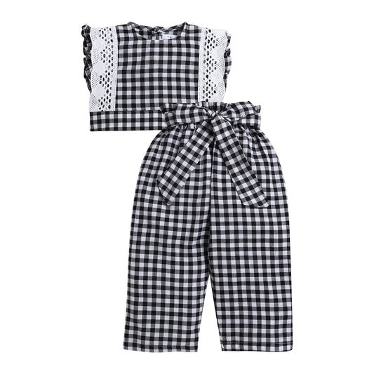 Black & White Checks Coord Set- Crop Top With Lace And Paper Bag Pant