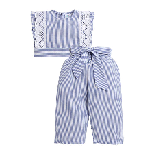 Blue and White Stripes Coord Set- Crop Top With Lace And Paper Bag Pants