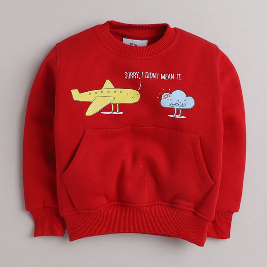 Knitting Doodles Fleece Kid's Red Round Neck Cloud and Aeroplane Print Jogger Set-Red