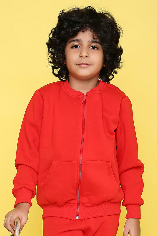 Knitting Doodles Fleece Kid's Red Round Neck Hooray Print Jacket- Red