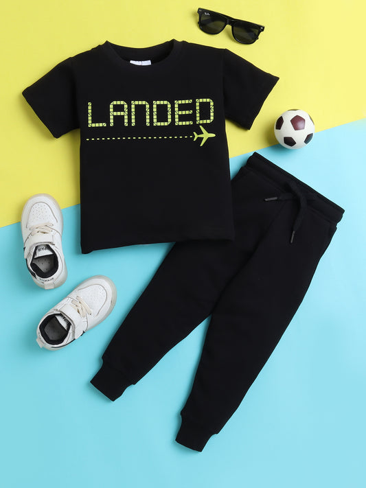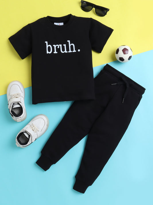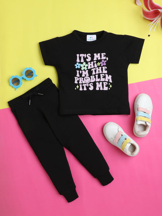 Girls' Terry Jogger Set with Cute Slogan Print- Black