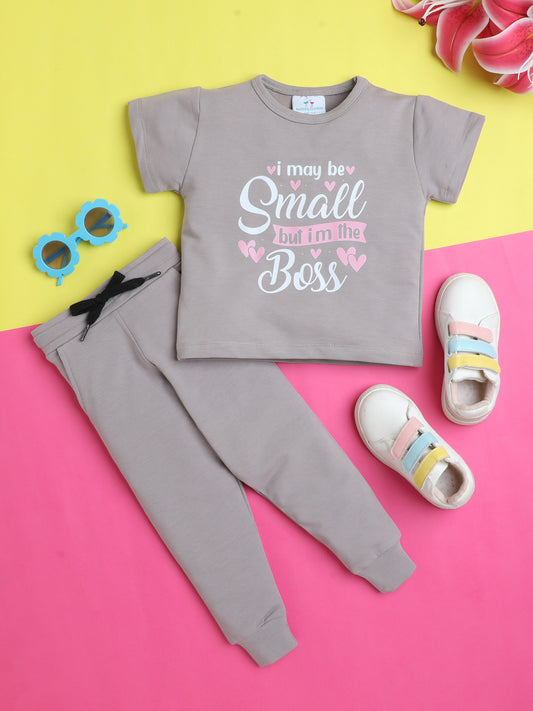 Girls' Terry Jogger Set with Cute Slogan Print- Grey