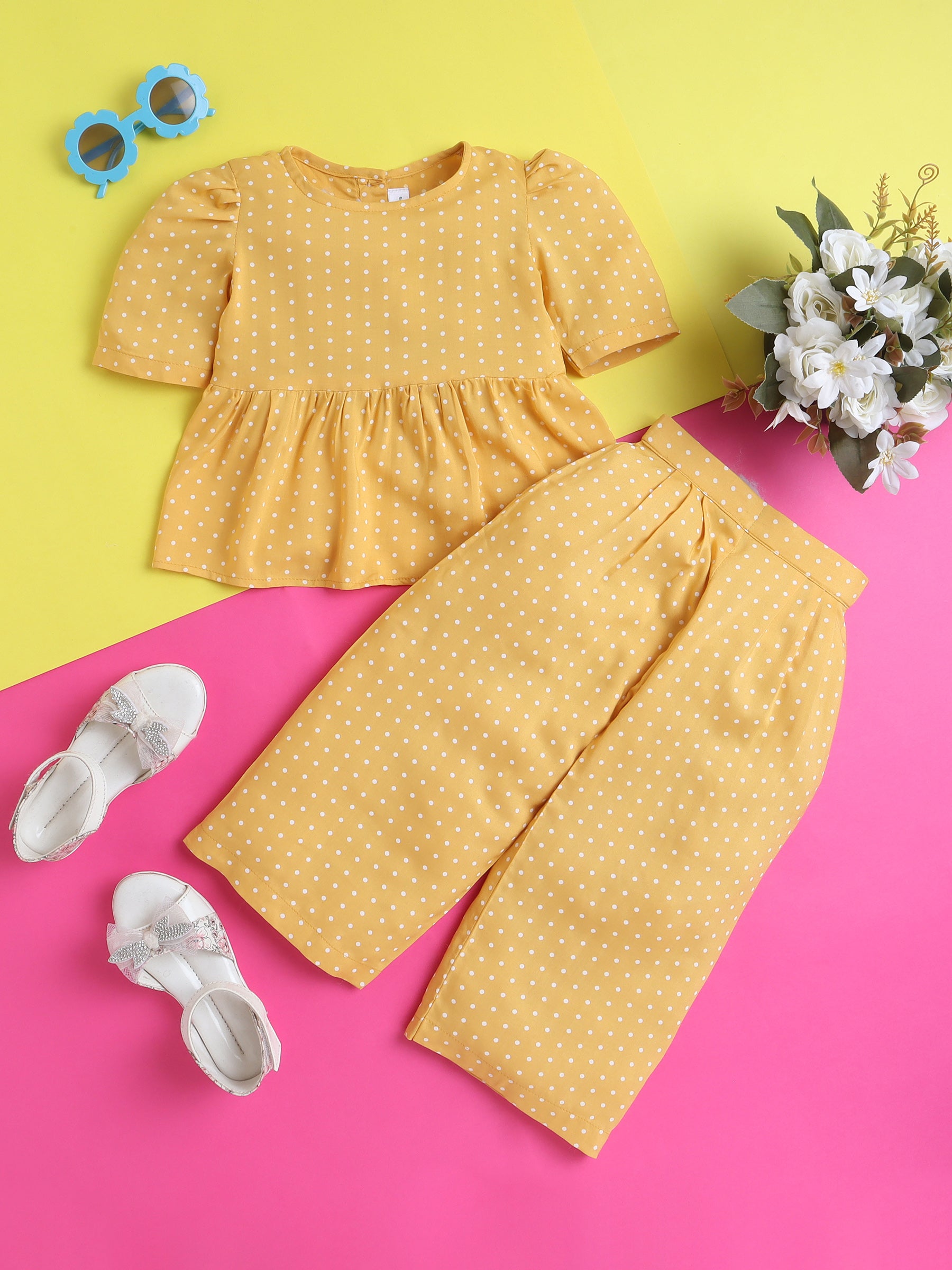 Yellow Polka Dots Coord set with Crop top and Pleated Pants