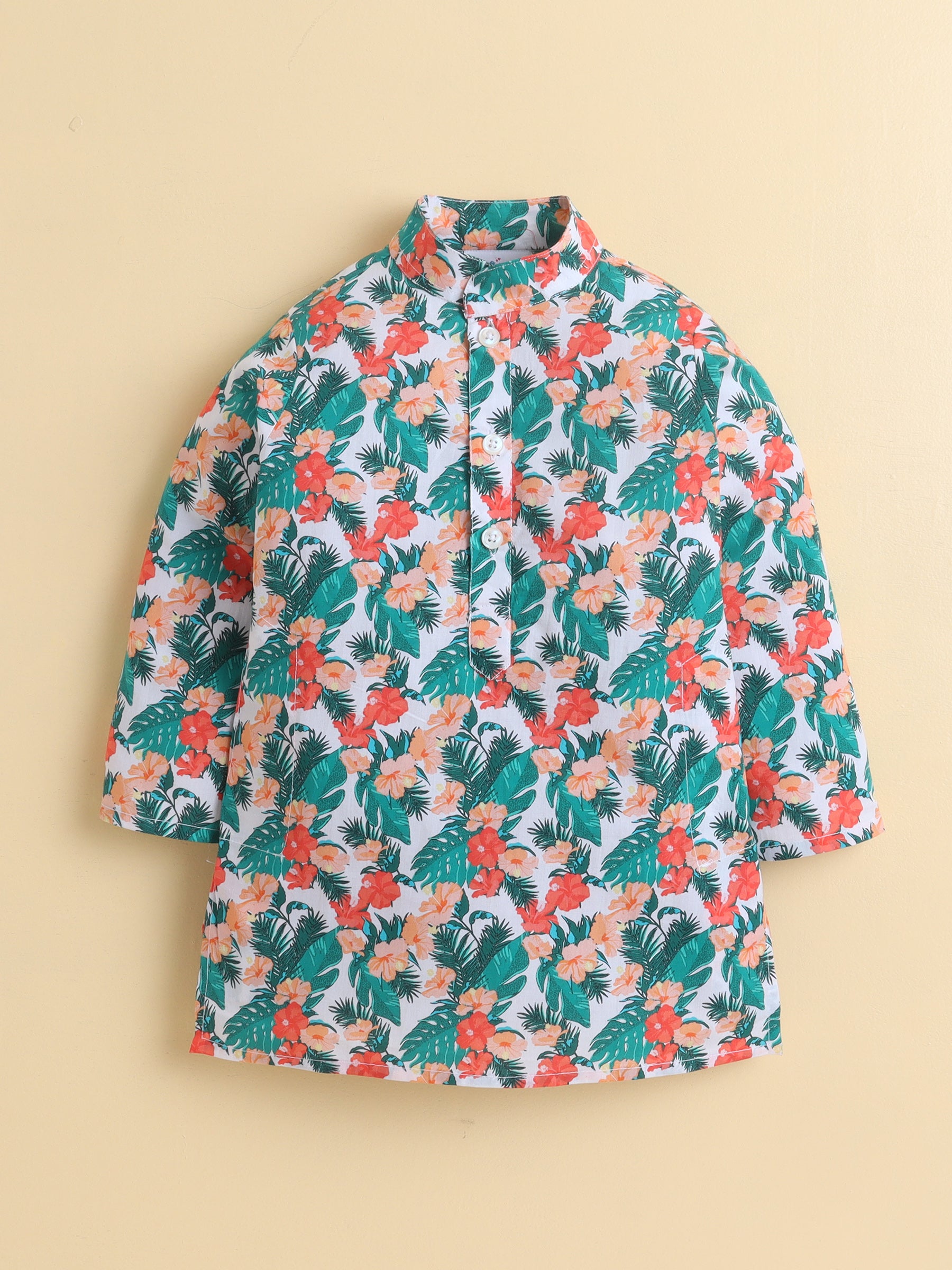 Bring a fresh festive vibe with this vibrant tropical floral kurta pyjama set. Crafted in soft cotton poplin with digital prints, it keeps your little one cool, comfortable, and celebration-ready all day long.